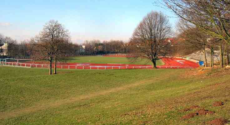 Die Tartanbahn des Infl im Januar 2006. Die Bahn und die davorliegende Wiese bieten die Jogging-Strecke, wenn es für den Hainberg aus den verschiedendsten Gründen nicht reicht. - Nach all den Jahren kennt mensch sich vom Vorbeilaufen. Sogar "richtige" Sportler sind anzutreffen: der Deutsche Meister im Zahnkampf, Herr Minah, und sein Trainer Geese, der Seniorenweltmeister im Zehnkampf. - Noch bin ich nicht der Konditionsärmste und Langsamste .... |