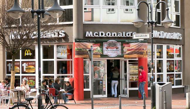 Für den ersten Hamburger mußte ich 1970 nach London fahren: dort gab es mobile Anbieter mit kleinen Schubkarren und "Wimpy's", eine Kette, die auf den Tischen das Ketchup nicht in Flaschen, sondern in roten Plastiktomaten bereitstellte. - In Bremen gab es dann nach einigen Jahren McDonalds am Bahnhof unter der Hochstraße. |