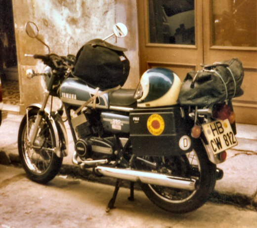 Yamaha RD 250: ein schneller Zweitakt-Twin mit 32 PS. 2 Motorschäden. Im Sommer 1976 angeschafft, im Übergang von Göttingen nach Bremen. Hier im Frühjahr 1977 an der Costa Brava. |