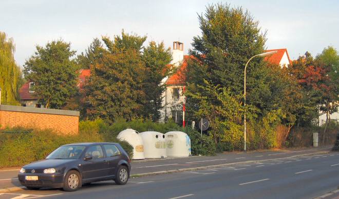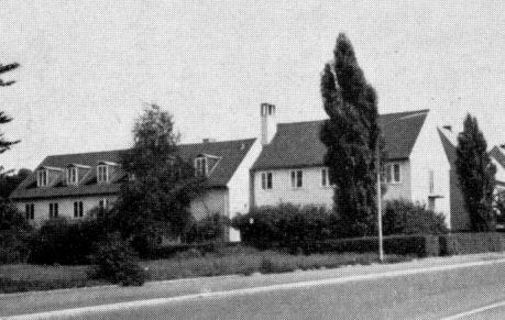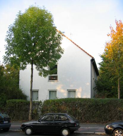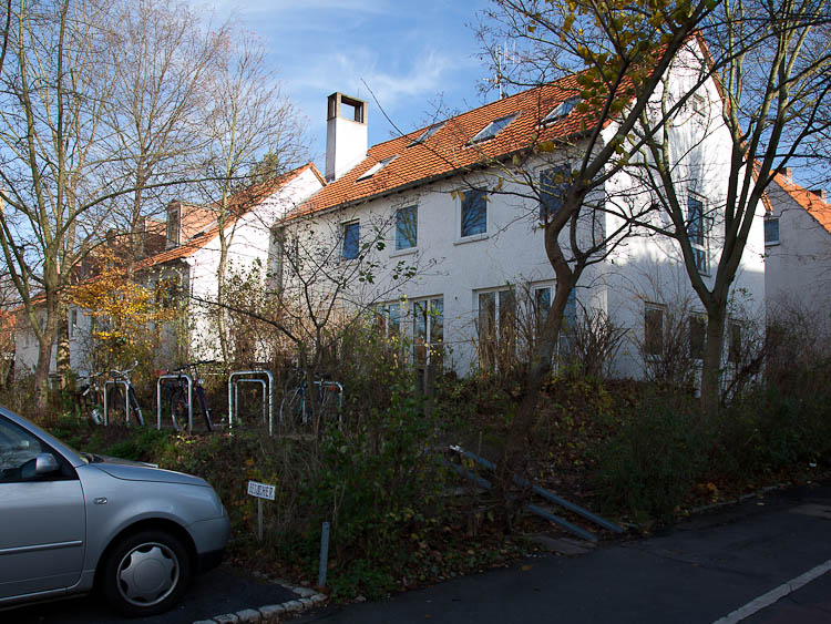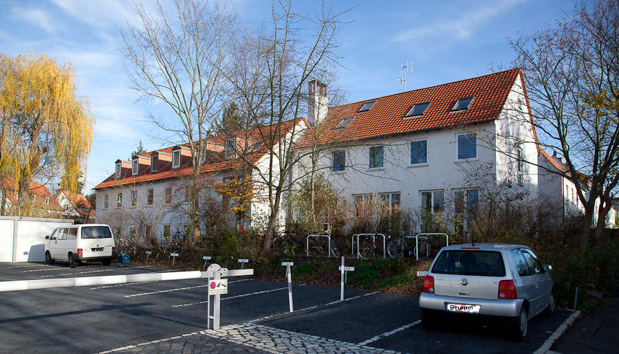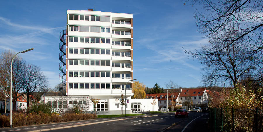Blick vom Parkplatz auf das HC. Links kommen der Flachbau und dann das Hochhaus der ESG.