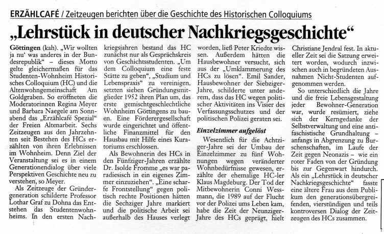 Ich zog nach dem Wintersemester 1970/1 ein, nachdem ich das Vorstellungsgespräch überstanden hatte. Das HC war selbstverwaltet und in politisches Wohnheim - und das es verschiedene linke Gruppen gab, war die Auswahl nicht ohne. Es war ein Interesse am HC selbst wichtig, da sonst die Selbstverwaltung nicht mehr durchführbar gewesen wäre.