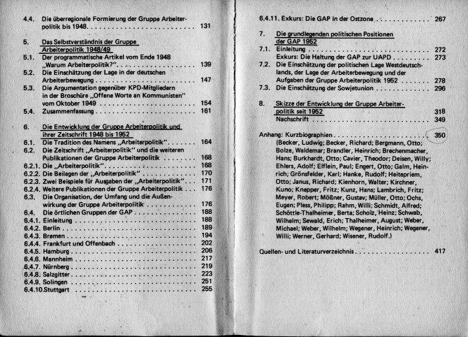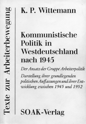 Cover, Inhaltsverzeichnis und Volltext zu:Klaus Peter Wittemann:Kommunistische Politik in Westdeutschland nach 1945.Der Ansatz der Gruppe Arbeiterpolitik. Darstellung ihrer grundlegenden Auffassungen und ihrer Entwicklung zwischen 1945 und 1952.SOAK-Verlag Hannover 1977. ISBN: 3 - 88 209 - 004 - 9Zur PDF-Fassung