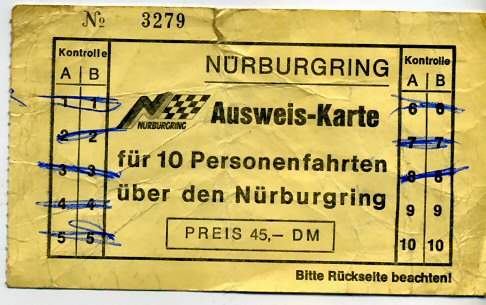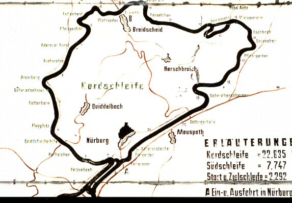 Ich fuhr im Sommer auf der Nordschleife, der "Grünen Hölle" - die alte Südschleife war schon gesperrt und wurde später durch den Neubau der jetzigen GP-Strecke ersetzt, die mit dem "Ring" vom Streckenprofil nichts mehr zu tun hat. |
