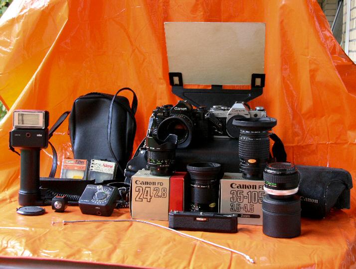Photophase seit 1979. Spiegelreflex Canon AE-1 und A-1. Winder, Systemblitz, Weitwinkel-, lichtstarkes Normal-, Porträt-Tele- und Alltagszoom-Objetive.